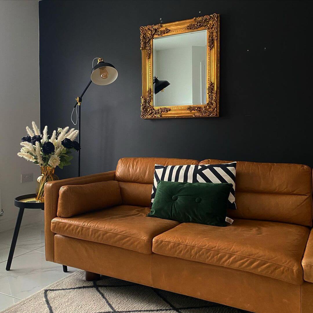 Antique mirrors are great statement pieces that double up as artworks when placed in the right position. Here, the mirror is centred above the sofa on a dark feature wall, giving it prominence and grandeur with its chunky gilded frame.