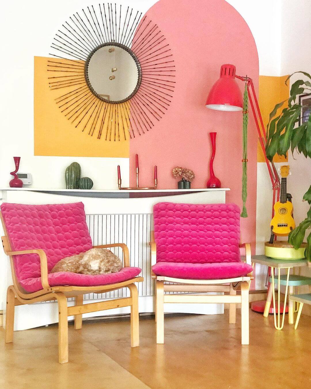 Everything in this space is unique and quirky, and the large, sunshine mirror completes the vibe. It also creates a nice blend in between the two juxta-positioned wall colour patterns.